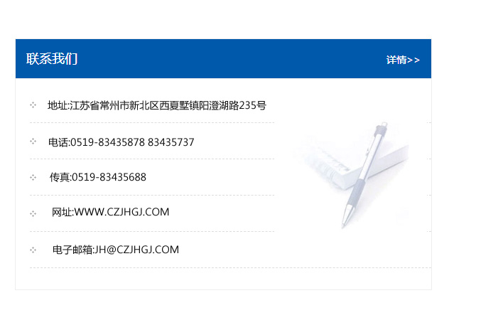地址:常州市新北區友邦商務大廈1幢16、17層  電話:0519-85101652  傳真:0519-85112595  郵編:213022  網址:www.cz-jiayue_cn.sdzangyao.com  郵箱:xiajifengaa@163.com